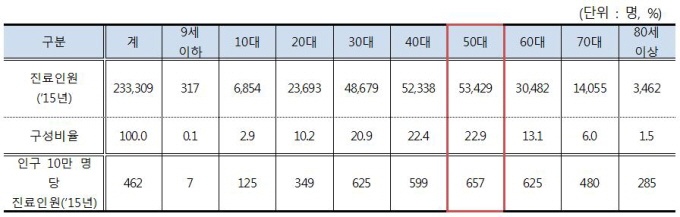 Àα¸ 10¸¸¸í ´ç ȯÀÚ ¼ö¸¦ ºÐ¼®ÇÑ °á°ú¿¡¼µµ 50´ë°¡ 657¸íÀ¸·Î °¡Àå ¸¹¾Ò´Ù. Àü ¿¬·É Æò±Õ 462¸íÀ» ÈξÀ ¿ôµµ´Â ¼öÄ¡·Î ±â·ÏµÈ °ÍÀÌ´Ù.