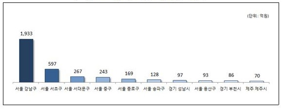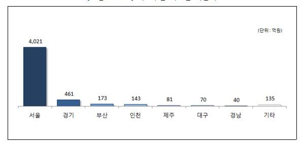 ½Ãµµº°·Î´Â ¼öµµ±Ç¿¡ ÁýÁßµÈ °æÇâÀÌ ³ªÅ¸³µ´Ù. ¼¿ïÀÌ 4021¾ï¿øÀ¸·Î 78.5%ÀÇ Á¡À¯À²À» º¸¿´°í °æ±â°¡ 461¾ï¿øÀ¸·Î 9%¸¦ ±â·ÏÇß´Ù. ¼¿ï°ú °æ±â Áö¿ª¸¸À¸·Îµµ 87.5%ÀÇ Á¡À¯À²À» º¸ÀÎ °ÍÀÌ´Ù.