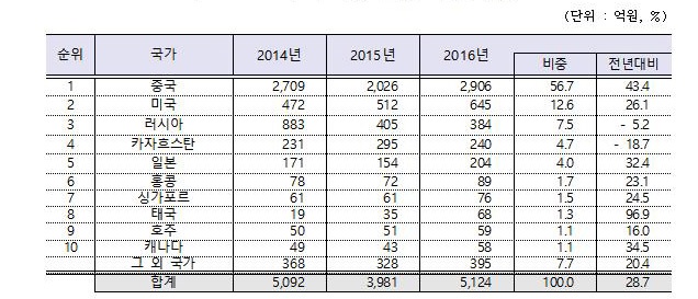 ±¹°¡º°·Î´Â Áß±¹¿¡ ÀÌ¾î ¹Ì±¹ÀÌ 12.6%ÀÎ 645¾ï¿ø, ·¯½Ã¾Æ°¡ 7.5%ÀÎ 384¾ï¿øÀ» ÁöÃâÇÑ °ÍÀ¸·Î ³ªÅ¸³µÀ¸¸ç, Ä«ÀÚÈ彺ź, ÀϺ», È«Äá µîÀÌ ±× µÚ¸¦ À̾ú´Ù.