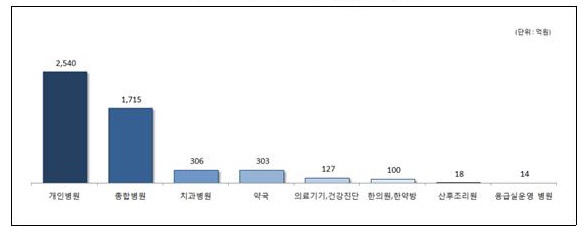 ¾÷Á¾º°·Î´Â °³Àκ´¿øÀÌ 2540¾ï¿øÀ¸·Î 49.6% Àüü ÀÇ·áºÎ¹® »ç¿ëÀÇ Àý¹Ý¿¡ À°¹ÚÇß°í, Á¾ÇÕº´¿øÀÌ 1715¾ï¿øÀ¸·Î 33.5%, Ä¡°úº´¿øÀÌ 306¾ï¿øÀ¸·Î 6.0%¸¦ ±â·ÏÇØ ±× µÚ¸¦ À̾ú´Ù.