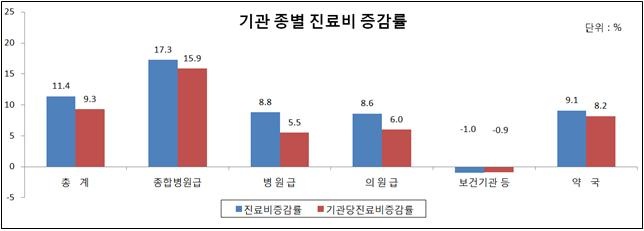 Á¾º° Áø·áºñ Áõ°¡À²À» µûÁ®º¸¸é Ä¡°úº´¿ø 21.3%, Ä¡°úÀÇ¿ø 21.0%, »ó±ÞÁ¾ÇÕº´¿ø 20.1% ¼øÀ¸·Î ³ªÅ¸³µ´Ù. Áø·áºñ¸¦ ¿ä¾ç±â°ü ¼ö·Î ³ª´« ±â°ü´ç Áø·áºñ´Â »ó±ÞÁ¾ÇÕº´¿ø 20.1%, Ä¡°úÀÇ¿ø 18.0%, Ä¡°úº´¿ø 15.9% ¼øÀ¸·Î Áõ°¡Çß´Ù.