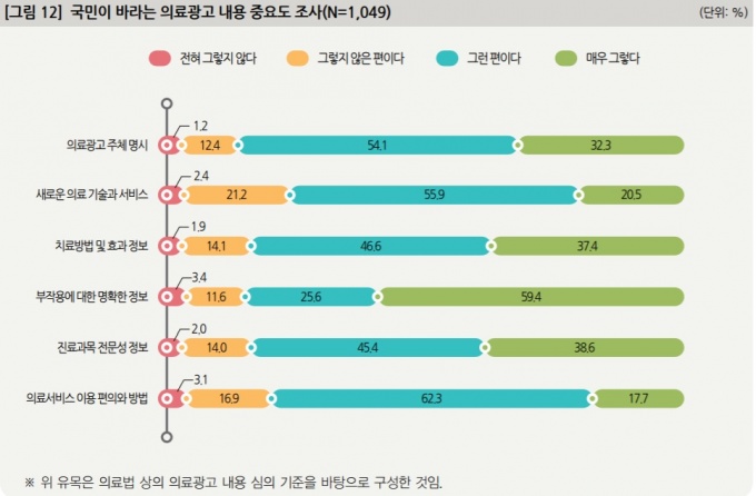 ÇÑÆí ±¹¹ÎµéÀÌ »ý°¢ÇÏ´Â ±¤°í ³»¿¡ Æ÷ÇÔµÅ¾ß ÇÒ Áß¿äÇÑ ³»¿ëÀ¸·Î´Â ¡ãÀǷᱤ°í ÁÖü ¸í½Ã (86.4%) ¡ãºÎÀÛ¿ë¿¡ ´ëÇÑ Á¤º¸(85%) ¡ãÄ¡·á¹æ¹ýÀ̳ª È¿°ú¿¡ ´ëÇÑ Á¤È®ÇÑ Á¤º¸(84%) ¡ãÁø·á°ú¸ñ Àü¹®¼º Á¤º¸(84%) µîÀÌ ÀÖ¾ú´Ù.