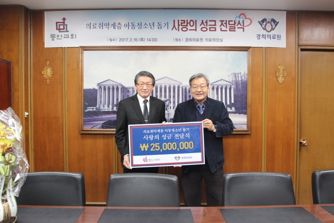 °æÈñÀÇ·á¿ø(¿øÀå ÀÓ¿µÁø)Àº ÃÖ±Ù µ¿¾È±³È¸¿Í ÀÇ·áÃë¾à°èÃþ ¾Æµ¿·Ã»¼Ò³â ÀÇ·áºñ Áö¿øÀ» À§ÇÑ ¼º±Ý Àü´Þ½ÄÀ» ÁøÇàÇß´Ù. Àü´Þ½Ä¿¡´Â ÀÓ¿µÁø ÀÇ·á¿øÀå, ±è°Ç½Ä °æÈñ´ëº´¿øÀå, µ¿¾È±³È¸ ±èÇüÁØ ´ãÀÓ ¸ñ»ç, ÃÖÀ±Ã¶ Àå·Î µîÀÌ Âü¼®Çß´Ù.
