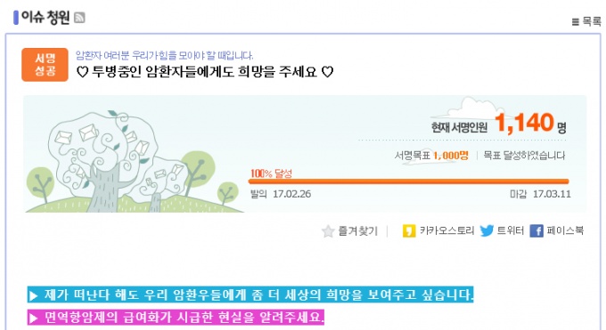 Áö³ 2¿ù 26ÀÏ '¾Æ°í¶ó'¿¡ ‘Åõº´ ÁßÀÎ ¾Ï ȯÀڵ鿡°Ôµµ Èñ¸ÁÀ» ÁÖ¼¼¿ä’¶ó´Â Á¦¸ñÀÇ ¸é¿ªÇ×¾ÏÁ¦ ±Þ¿©È¸¦ Ã˱¸Çϴ û¿øÀÌ ¿Ã¶ó¿Ô´Ù. 3¿ù 11ÀϱîÁö 1000¸íÀÇ ¼¸íÀ» ¸ñÇ¥·Î ÇÑ ÀÌ Ã»¿øÀº ¹ú½á 1000¸íÀ» Èǽ ³Ñ°å´Ù. [»çÁø]
