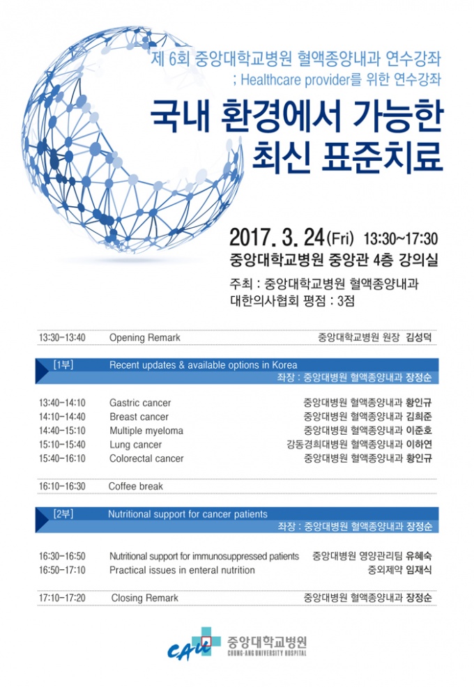 1ºÎ¿¡¼´Â ‘Recent updates & available options in Korea(±¹³» ÃֽŠǥÁØÄ¡·á)’¿¡ ´ëÇØ ¡ãÀ§¾Ï(Ç÷¾×Á¾¾ç³»°ú ȲÀÎ±Ô ±³¼ö) ¡ãÀ¯¹æ¾Ï(Ç÷¾×Á¾¾ç³»°ú ±èÈñÁØ ±³¼ö) ¡ã´Ù¹ß¼º °ñ¼öÁ¾(Ç÷¾×Á¾¾ç³»°ú ÀÌÁØÈ£ ±³¼ö) ¡ãÆó¾Ï(°µ¿°æÈñ´ëº´¿ø Ç÷¾×Á¾¾ç³»°ú ÀÌÇÏ¿¬ ±³¼ö) ¡ã´ëÀå¾Ï(Ç÷¾×Á¾¾ç³»°ú ȲÀÎ±Ô ±³¼ö)À¸·Î ³ª´©¾î °¿¬ÀÌ ÁøÇàµÈ´Ù.