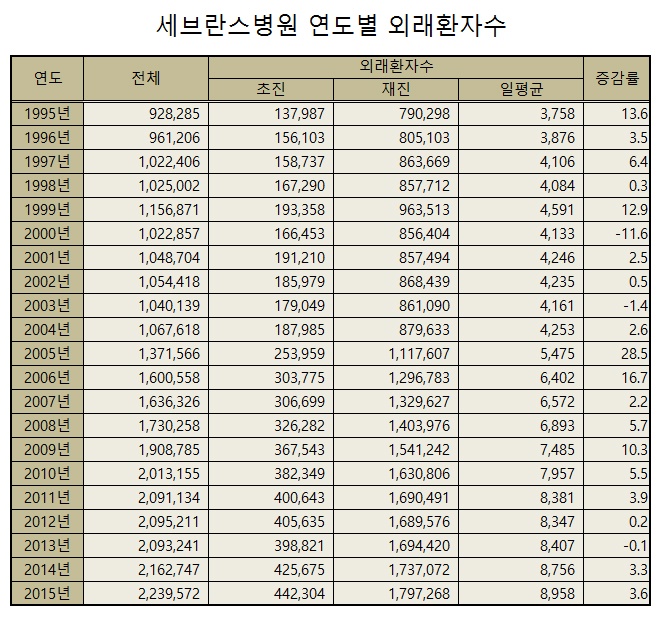 ¼¼ºê¶õ½ºº´¿øÀº 2015³â ÃÊÁøÈ¯ÀÚ 44¸¸2304¸í°ú ÀçÁøÈ¯ÀÚ 179¸¸7268¸í µî ÃÑ 224¸¸¸íÀ» Áø·áÇß´Ù.