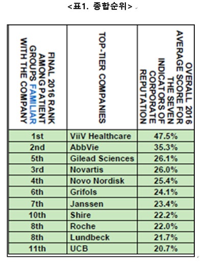 ÀÌ´Â ±Û·Î¹ú º¸°Ç»ê¾÷ ¿¬±¸ ¹× ÀÚ¹®È¸»çÀÎ ÆäÀÌ¼ÇÆ®ºä(Patient View)°¡ 105°³±¹ 1463°³ ȯÀÚ ´Üü¸¦ ´ë»óÀ¸·Î ½Ç½ÃÇÑ ‘2016 Á¦¾à»ç ÆòÆÇ ÀνÄÁ¶»ç(The 2016 Corporate Reputation of the Pharma Industry)’ °á°ú´Ù.