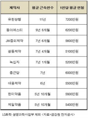 10´ë Á¦¾à»ç Áß °¡Àå ±Ù¼Ó¿¬¼ö°¡ ª¾Ò´ø Á¦¾à»ç´Â Çѹ̾àǰ°ú Á¦ÀϾàǰÀ¸·Î 5³â 10°³¿ù, 1ÀÎ´ç Æò±Õ ¿¬ºÀÀÌ °¡Àå ³·¾Ò´ø Á¦¾à»ç´Â ±¤µ¿Á¦¾àÀ¸·Î 5100¸¸¿øÀ̾ú´Ù.