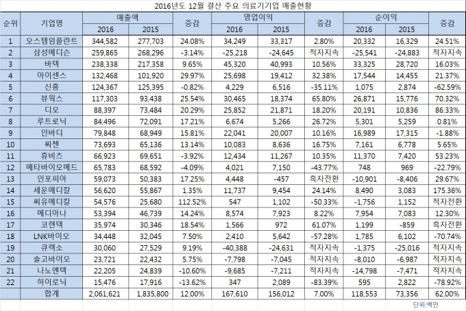 µ¥Àϸ®¸Þµð°¡ ÃÖ±Ù ÀüÀÚ°ø½Ã½Ã½ºÅÛ¿¡ ¹ßÇ¥µÈ »óÀ§ 20À§±Ç ÀÇ·á±â±â¾÷üµéÀÇ 2016³âµµ °á»ê °ø½Ã¸¦ ºÐ¼®ÇÑ °á°ú, Àü³â´ëºñ ¸ÅÃâ¾×ÀÌ 12% Áõ°¡ÇßÀ¸¸ç ¿µ¾÷ÀÌÀÍÀº 7%, ¼øÀÌÀÍÀº 62% ³ô¾ÆÁø °ÍÀ¸·Î ¹àÇôÁ³´Ù.