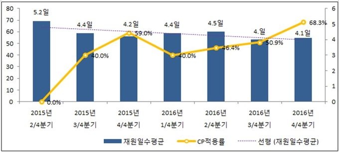 ‘Å»Àå’ÀÇ °æ¿ì CP º¸±Þ ÀÌÈÄ 5.6ÀÏÀÌ´ø Àç¿øÀϼö°¡ 4.4ÀÏ·Î ÁÙ¾ú´Ù. ‘½½°üÀýġȯ¼ú’ ¿ª½Ã CP ¹ÌÀû¿ë ȯÀÚ±º(31.6ÀÏ)¿¡ ºñÇØ Àû¿ë ȯÀÚ±ºÀÇ Àç¿øÀϼö(26.6ÀÏ)°¡ 5ÀÏ °¨¼ÒµÆ´Ù.