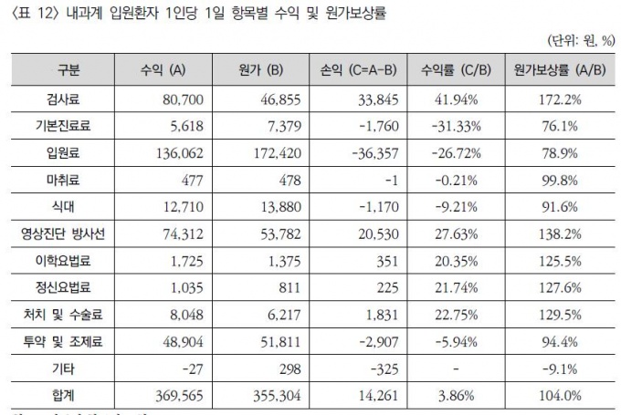 ±¸Ã¼ÀûÀ¸·Î ³»°ú°èÀÇ °æ¿ì ÀÔ¿ø·á ¿ø°¡º¸»ó·üÀº 78.9% ¼öÁØÀÌ´Ù. ÇÏÁö¸¸ °Ë»ç·á(172.2%), ¿µ»óÁø´Ü¹æ»ç¼±·á(138.2%) µî ³ôÀº ¼öÁØÀÇ º¸»óÀÌ ÀÌ·ïÁ® ¼öÀÍ·üÀÌ ³ªÅ¸³´Ù´Â ºÐ¼®ÀÌ´Ù. ȯÀÚ 1ÀÎ´ç ¿ø°¡º¸»ó·üÀº 105.3%¶ó´Â °á·ÐÀÌ´Ù.