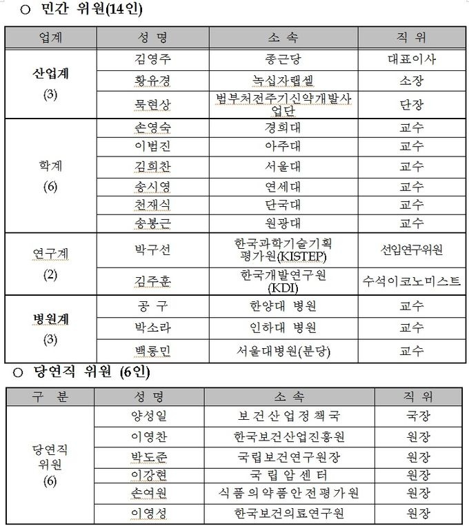 À̹ø »õ·Î ±¸¼ºµÈ º¸°ÇÀÇ·á±â¼úÁ¤Ã¥½ÉÀÇÀ§¿øÈ¸(ÀÌÇÏ º¸Á¤½É)´Â À§¿øÀåÀ» Æ÷ÇÔÇØ 20ÀÎ(¹Î°£À§¿ø 14ÀÎ, ´ç¿¬Á÷À§¿ø 6ÀÎ)À¸·Î ¿î¿µµÈ´Ù.