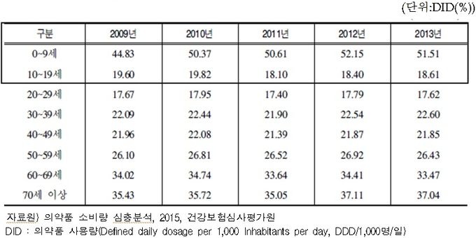 ¿¬·É±ºº° Ç×»ýÁ¦ »ç¿ë·®¿¡¼µµ ¼Ò¾ÆÈ¯ÀÚÀÇ ºñÀ²ÀÌ ¿ùµîÈ÷ ³ô¾Ò´Ù. 2013³â 0~9¼¼ÀÇ Ç×»ýÁ¦ »ç¿ë·®Àº 51.51DID·Î, Àüü ¿¬·É Áß °¡Àå ¸¹¾Ò´Ù.