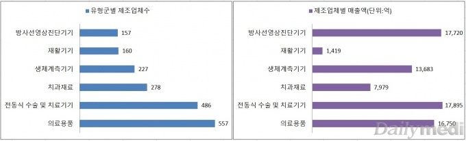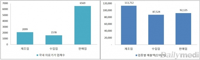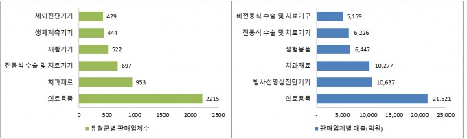 ±¹³» ÀÇ·á±â±â »ç¾÷ü´Â ÃÑ 1¸¸246°÷¿¡ ´ÞÇϸç ÀÌ Áß ÆÇ¸Å¾÷ü°¡ 6569°³·Î °¡Àå ¸¹´Ù. ¹Ý¸é ¸ÅÃâ¾×Àº Á¦Á¶¾÷ü°¡ Á¦ÀÏ ¸¹¾Ò´Ù. ¾÷Á¾º° ¸ÅÃâ¾×Àº Á¦Á¶¾÷ ºÐ¾ß°¡ 11Á¶, ÆÇ¸Å¾÷°ú ¼öÀÔ¾÷ü°¡ °¢°¢ 9Á¶¿Í 8Á¶¿øÀÌ ³Ñ¾ú´Ù.