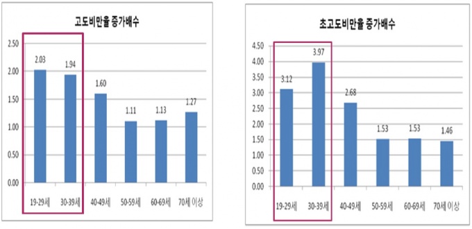 2015³â °Ç°º¸Çè°ø´ÜÀÌ ¹ßÇ¥ÇÑ ºòµ¥ÀÌÅÍ ½ÇÅÂÁ¶»ç¿¡ µû¸£¸é Áö³ 10³â °£ ÀÏ¹Ý ºñ¸¸(BMI 25ÀÌ»ó) ȯÀÚ´Â Å©°Ô ´Ã¾î³ªÁö ¾Ê¾Ò´Ù. ÇÏÁö¸¸ °íµµºñ¸¸(BMI 30ÀÌ»ó)°ú ÃÊ°íµµºñ¸¸(BMI 35ÀÌ»ó)ÀÇ °æ¿ì °¢°¢ 1.6¹è, 2.6¹è·Î Áõ°¡Çß´Ù.