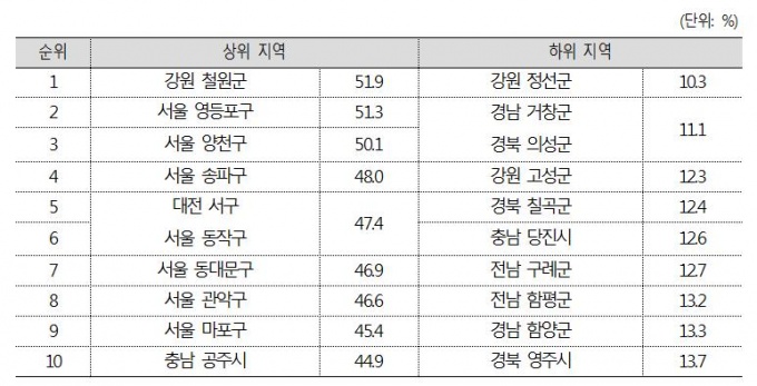 °¡Àå ³·Àº Áö¿ªÀº °æºÏ ¿µ¾ç±º(15.4%), °æ±â °úõ½Ã(15.7%), ´ëÀü À¯¼º±¸(15.9%), °æ³² Çϵ¿±º(16.2%), °æ±â ¼º½Ã ºÐ´ç±¸ ¹× ´ë±¸ ¼ö¼º±¸(16.6%) µîÀ̾ú´Ù.