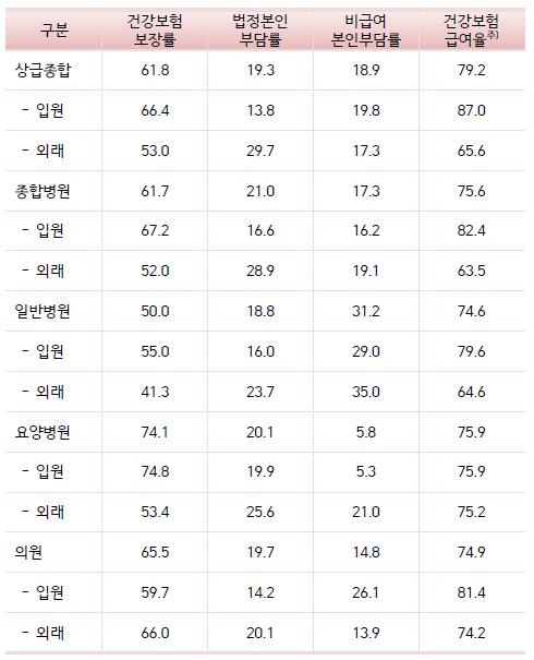2015³â ±âÁØ Àüü °Ç°º¸Çè º¸Àå·üÀº 63.4%, 4´ëÁßÁõÁúȯ°ú °í¾×Áø·áºñ Áúȯ º¸Àå·üÀº 79.9%·Î Á¶»çµÆ´Ù. ºñ±Þ¿© ºñÀ²Àº 16.5%·Î Á¡Á¡ ÁÙ¾îµé°í ÀÖÁö¸¸ ¿©ÀüÈ÷ Á¦µµÀû °³¼±ÀÌ ¿ä±¸µÇ´Â »óȲÀÌ´Ù.