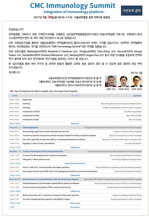 °¡Å縯´ëÇб³ ¼¿ï¼º¸ðº´¿ø(¿øÀå ½Â±â¹è)Àº ¿À´Â 28ÀÏ ¿ÀÀü 8½ÃºÎÅÍ º»°ü ÁöÇÏ ´ë°´ç¿¡¼ ±¹Á¦°øµ¿½ÉÆ÷Áö¾ö ‘CMC Immunology Summit'¸¦ °³ÃÖÇÑ´Ù°í 21ÀÏ ¹àÇû´Ù.