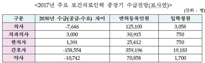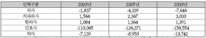 ¿¬±¸°á°ú¿¡ µû¸£¸é 2030³âÀÌ µÇ¸é ÀÇ»ç´Â 7600¸í, °£È£»ç´Â 15¸¸8000¸í, ¾à»ç´Â 1¸¸¸íÀÌ ºÎÁ·Çϰí, Ä¡°úÀÇ»ç´Â 3000¸í, ÇÑÀÇ»ç´Â 1400¸íÀÌ °úÀ× °ø±ÞµÇ´Â °ÍÀ¸·Î Ãß°èµÆ´Ù.