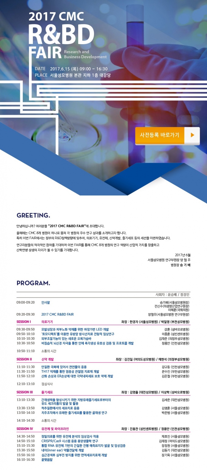 °¡Å縯Áß¾ÓÀÇ·á¿ø »êÇÏ 8°³º´¿øÀÌ ¸ð¿© ¿¬±¸¼º°ú¸¦ ¼Ò°³ÇÏ´Â 2017 CMC R&BD FAIR°¡ ¿À´Â 6¿ù15ÀÏ ¿ÀÀü 9½ÃºÎÅÍ ¼¿ï¼º¸ðº´¿ø º»°ü ÁöÇÏ 1Ãþ ´ë°´ç¿¡¼ °³ÃֵȴÙ.