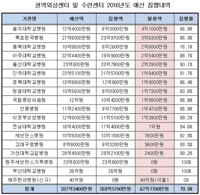 º¸°Çº¹ÁöºÎ°¡ ÀÛ¼ºÇÑ ‘2016³â ÀÀ±ÞÀÇ·á±â±Ý °á»ê ÀÚ·á’¿¡ µû¸£¸é Áö³ÇØ Àü±¹ 18°³ ±Ç¿ª¿Ü»ó¼¾ÅÍ ¹× ¼ö·Ã¼¾ÅÍ Ã⿬ ¹× º¸Á¶»ç¾÷ ¿¹»ê Áß 67¾ï7700¸¸¿øÀÌ »ç¿ëµÇÁö ¸øÇß´Ù.