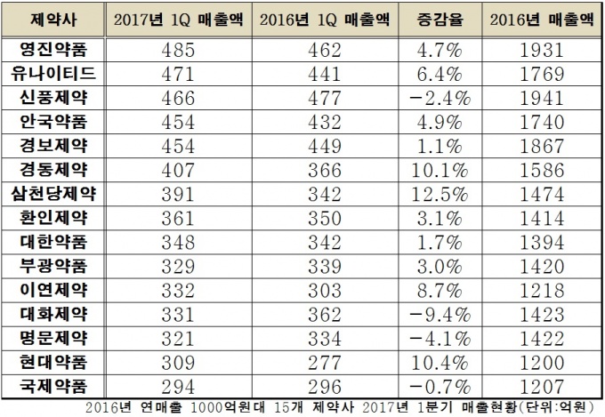 »ïõ´çÁ¦¾àÀº 1ºÐ±â 391¾ï¿øÀÇ ¸ÅÃâÀ» ±â·ÏÇØ Áö³ÇØ °°Àº ±â°£ 342¾ï¿ø¿¡¼ 12.5%, Çö´ë¾àǰÀº 309¾ï¿øÀ¸·Î Áö³Çغ¸´Ù 10.4% ¼ºÀåÇß´Ù. °æµ¿Á¦¾à ¶ÇÇÑ 10.1% »ó½ÂÇÑ 407¾ï¿øÀ» ±â·ÏÇß´Ù.
