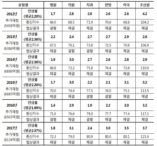 ´ëÇѺ´¿øÇùȸÀÇ Áö³ 6³â°£ ¼ö°¡Çù»ó °á°ú¸¦ »ìÆìº¸¸é ¡ã2012³â Ãß°¡¼Ò¿äÀçÁ¤ 1650¾ï¿ø·Àλó·ü 1.7% ¡ã2013³â 3138¾ï¿ø·2.2% ¡ã2014³â 2970¾ï¿ø·1.9% ¡ã2015³â 2819¾ï¿ø·1.7% ¡ã2016³â 2517¾ï¿ø·1.4% ¡ã2017³â 3440¾ï¿ø·1.8%·Î Áý°èµÆ´Ù.