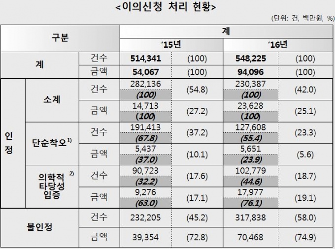 Áï, »óº´¸í Àû¿ë ¿À·ù ¹× ´©¶ô, ¼ö°¡·¾à°¡ ÄÚµå Âø¿À µî ¿ä¾ç±â°ü¿¡¼ û±¸ ½Ã ½Ç¼öÇÑ ºÎºÐÀÌ ¸¹¾Æ ´Ù½Ã ÀçÁ¶Á¤ÇÑ °Ç¼ö°¡ 2015³âÀº 19¸¸1413°Ç, 2016³âÀº 12¸¸7608°ÇÀ¸·Î Áý°èµÆ´Ù´Â °ÍÀÌ´Ù.