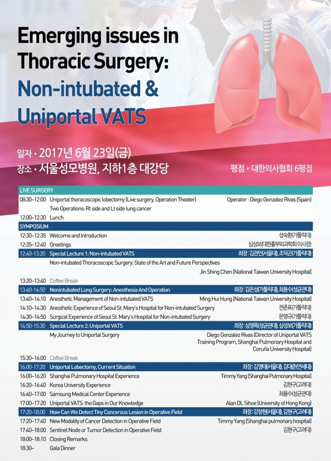 ƯÈ÷ ´ÜÀϰø Æó ¼ö¼ú·Î À¯¸íÇÑ ½ºÆäÀÎÀÇ Diego Gonzalez Rivas ±³¼ö¿Í ¼¿ï¼º¸ðº´¿ø ÈäºÎ¿Ü°ú ¼º¼÷ȯ ±³¼öÀÇ Uniportal VATS¿¡ ´ëÇÑ live surgery ¹× °ÀǸ¦ ½ÃÀÛÀ¸·Î ¼¼°è¿¡¼ °¡Àå Ȱ¹ßÈ÷ Non-intubated VATS·Î Æó¼ö¼úÀ» ½ÃÇàÇϰí ÀÖ´Â ´ë¸¸ ±¹¸³º´¿ø ÈäºÎ¿Ü°ú Jin Shing Chen ±³¼öÀÇ °ÀÇ µîÀÌ ÁغñµÅ ÀÖ´Ù.