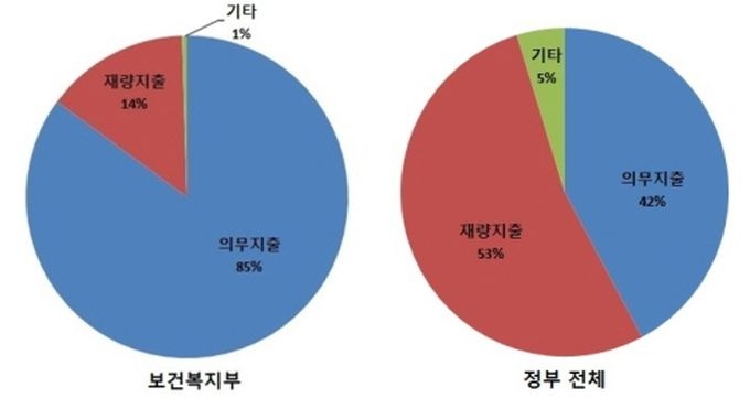 Áö³ 2017³â º¹ÁöºÎ ¿¹»ê 57Á¶6628¾ï¿ø Áß 85% ÀÌ»óÀÌ Àǹ«ÁöÃâÀÌ´Ù. ÀÌ´Â Á¤ºÎ Àüü ¿¹»êÀÇ Àǹ«ÁöÃâ 42.2%°ú ºñ±³ÇØ µÎ ¹è°¡ ³Ñ´Â ¼öÄ¡´Ù.