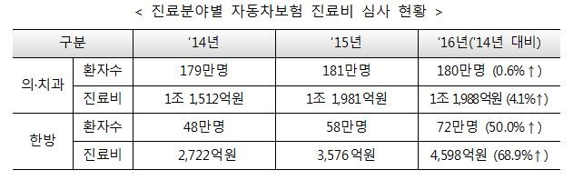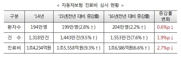À§Å¹»ç¾÷ ÃʱâÀÎ 2014³â ÃÑ ÀÚµ¿Â÷º¸Çè Áø·áºñ´Â 1Á¶4234¾ï¿ø ¼öÁØÀ̾ú´Ù°¡ 2015³â 1Á¶5557¾ï¿øÀ¸·Î ‘9.3%’ Áõ°¡Çß´Ù. 2016³â ÃÑ Áø·áºñ´Â 1Á¶6586¾ï¿øÀ¸·Î Áý°èµÆ´Âµ¥, ÀÌ´Â Àü³â´ëºñ ‘6.6%’ Áõ°¡¿¡ ¸Ó¹°·¶´Ù´Â °ÍÀÌ´Ù.