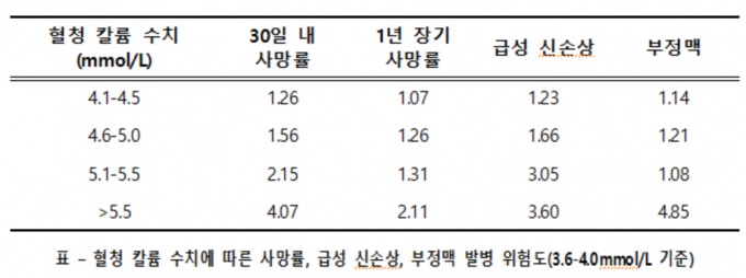 ƯÈ÷ ±Þ¼º ½Å¼Õ»óÀÌ ¹ßº´ÇÒ À§ÇèÀº Ä®·ý¼öÄ¡°¡ 4.1mmol/LÀ̻󿡼ºÎÅÍ À¯ÀÇÇÏ°Ô Áõ°¡ÇßÀ½À» È®ÀÎÇÒ ¼ö ÀÖ¾ú´Ù. [¾Æ·¡Ç¥ ÂüÁ¶]