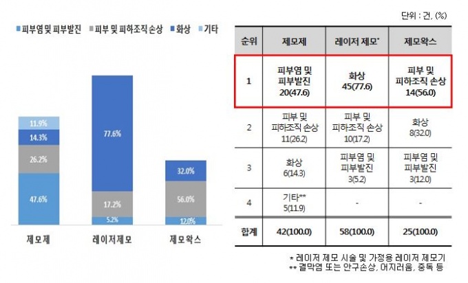 Á¦¸ð ¹æ¹ýº°·Î »ìÆìº¸¸é, Á¦¸ðÅ©¸²·Á¦¸ð½ºÇÁ·¹ÀÌ¿Í °°Àº ‘Á¦¸ðÁ¦’ »ç¿ëÀ¸·Î ÀÎÇÑ ºÎÀÛ¿ë ¹ß»ýÀÌ ÀüüÀÇ 36.2%(55°Ç)·Î °¡Àå ¸¹¾Ò´Ù. ´ÙÀ½À¸·Î´Â ÇǺΰú, ¼ºÇü¿Ü°ú µî¿¡¼ ¹ÞÀº ‘·¹ÀÌÀú Á¦¸ð ½Ã¼ú’ 32.9%(50°Ç), ‘Á¦¸ð¿Î½º’ 17.8%(27°Ç) ¼øÀ¸·Î Á¶»çµÆ´Ù.