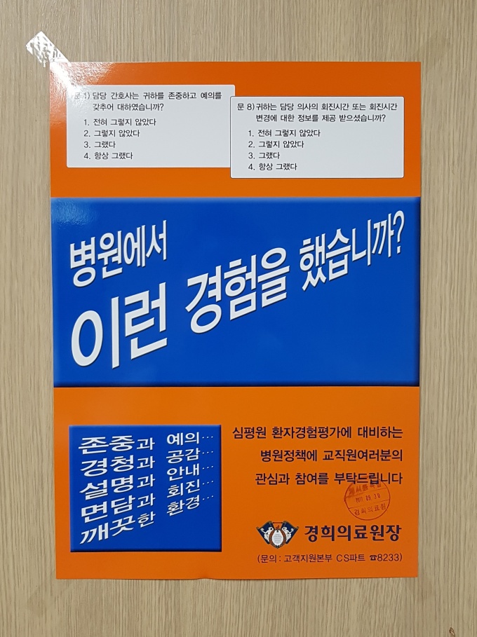 ¾Æ¿ï·¯ Æ÷½ºÅ͸¦ ºÙÀÌ´Â µî Àû±ØÀû È«º¸¸¦ ÅëÇØ ȯÀÚ°æÇè Æò°¡¿¡ ´ëºñÇØ ±³Á÷¿øµéÀÇ Âü¿©¸¦ µ¶·ÁÇϰí ÀÖ´Ù. [»çÁø]
