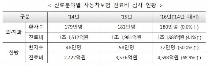 °Ç°º¸Çè°ú ´Þ¸® ÀÚµ¿Â÷º¸Çè¿¡¼ Çѹæ Áø·áºñ´Â ¹®Á¦ÀÇ ¿µ¿ªÀÌ´Ù. ÀÇ·Ä¡°ú Áø·áºñ´Â 2014³â 1Á¶1512¾ï¿ø¿¡¼ 2016³â 1Á¶1988¾ï¿øÀ¸·Î 4% Áõ°¡ÇÑ ¹Ý¸é ÇѹæÁø·áºñ´Â 2722¾ï¿ø¿¡¼ 4598¾ï¿øÀ¸·Î 69% Áõ°¡Çß´Ù.