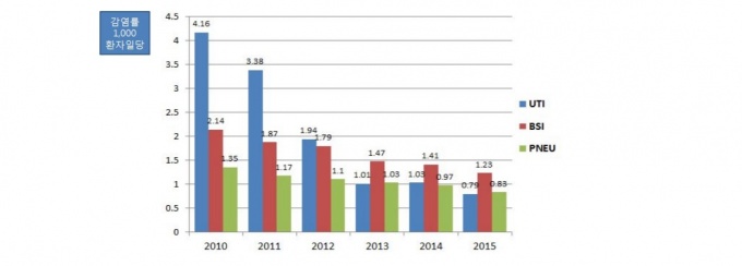 KONISÀÇ È¯ÀÚ Àç¿øÀϼö 1000ÀÏ´ç °¨¿°°Ç¼ö¸¦ »ìÆìº¸¸é ¿ä·Î°¨¿°(UTI, Urinary tract infection)Àº 2010³â 4.16°Ç¿¡¼ Á¡ÁøÀûÀ¸·Î °¨¼ÒÇØ 2015³â 0.79°Ç¿¡ ±×ÃÆÁö¸¸, Ç÷·ù°¨¿°Àº 2010³â 2.14°Ç¿¡¼ 2013³â 1.47°Ç, 2015³â 1.23°ÇÀ¸·Î °³¼±À» º¸ÀÌÁö ¸øÇϰí ÀÖ´Ù.