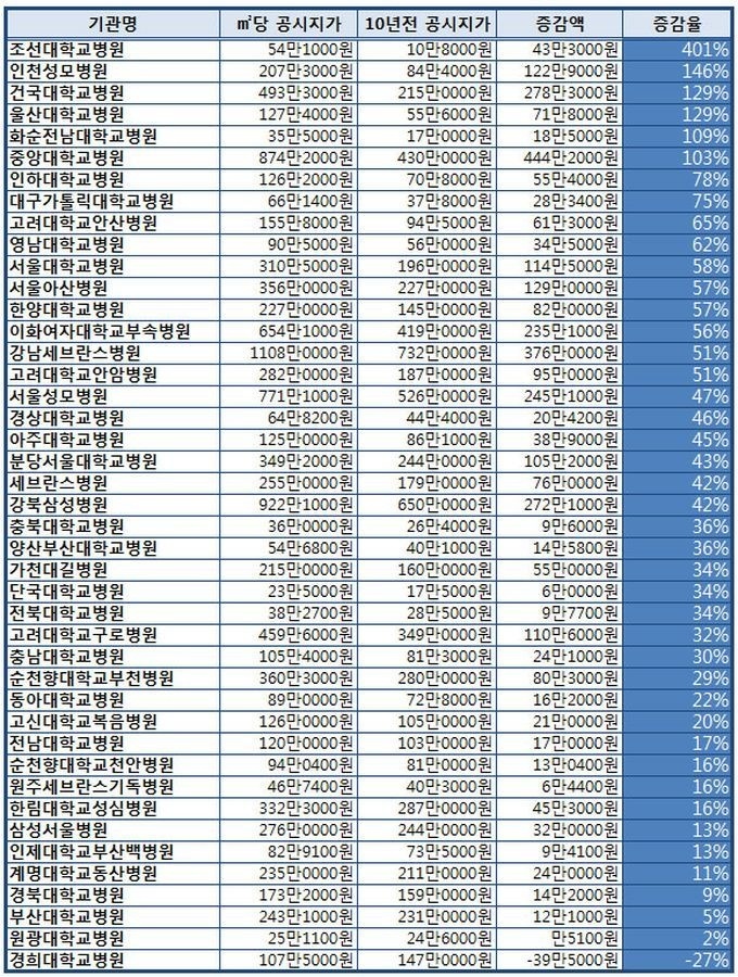 ½ÇÁ¦ 10³â Àü ´ëºñ °¡Àå ¸¹Àº ¶¥°ªÀÌ ¿À¸¥ º´¿øÀº Á¶¼±´ëÇб³ º´¿øÀ¸·Î, ¹«·Á 401%ÀÇ Áõ°¡À²À» ³ªÅ¸³Â´Ù. 2006³â 1§³ ´ç °ø½ÃÁö°¡´Â 10¸¸8000¿øÀ̾úÁö¸¸ 2016³â¿¡´Â 54¸¸ 1000¿øÀ¸·Î ²±Ãæ ¶Ù¾ú´Ù.