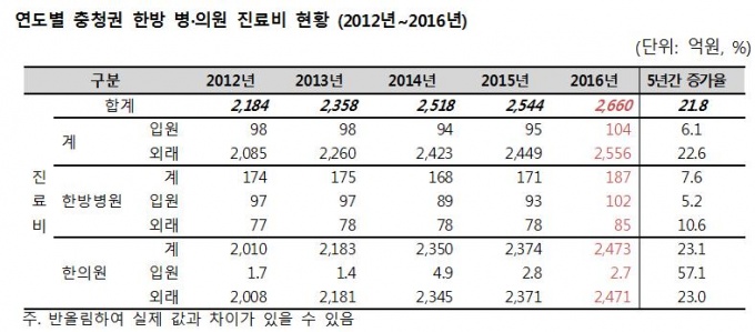 ÃæÃ»±Ç ÇÑ¹æ º´‧ÀÇ¿ø Áø·áºñ´Â 2012³â 2184¾ï¿ø¿¡¼ 2016³â 2660¾ï¿øÀ¸·Î 476¾ï¿øÀÌ ´Ã¾î 5³â»õ Áõ°¡À²Àº 21.8%·Î ³ªÅ¸³µ´Ù.