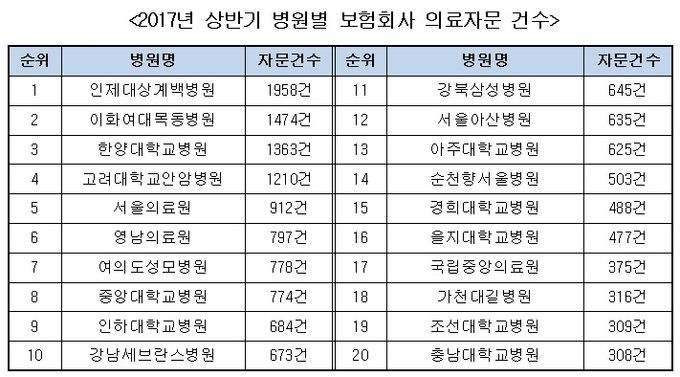 ÀÚ·á¿¡ µû¸£¸é ¼öµµ±Ç ´ëÇüº´¿øµéÀÌ ÁÖ¸¦ ÀÌ·é °¡¿îµ¥ ÀÎÁ¦´ëÇб³ »ó°è¹éº´¿øÀÌ 1958°ÇÀ¸·Î º¸Çèȸ»ç¿¡ °¡Àå ¸¹Àº ÀÇ·áÀÚ¹®À» Á¦°øÇÑ °ÍÀ¸·Î È®ÀεƴÙ.