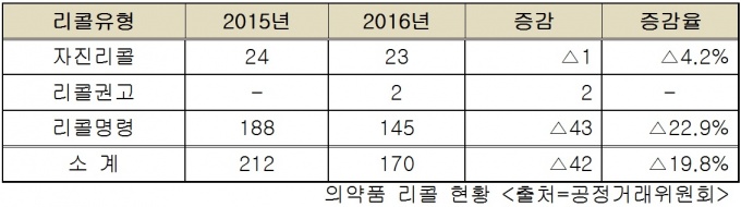 ¹ßÇ¥¿¡ µû¸£¸é Áö³ÇØ ÀǾàǰ ¸®ÄÝÀº ÃÑ 170°ÇÀ̾ú´Ù. ÀÌÁß ÇàÁ¤±â°ü ¸í·É¿¡ µû¸¥ ¸®ÄÝÀº 145°Ç, ±Ç°í¿¡ µû¸¥ ¸®Äݱǰí 2°Ç, »ç¾÷ÀÚ ½º½º·Î ´çÇØ ¹°Ç°À» ¼ö°Å ¹× ÆÄ±âÇÏ´Â ÀÚÁø¸®ÄÝÀÌ 23°ÇÀ¸·Î Áý°èµÆ´Ù.