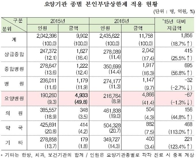 ¿ä¾ç±â°ü Á¾º° ÇöȲ¿¡¼µµ ÀÌ·¯ÇÑ Çö»óÀº µµµå¶óÁø´Ù. ³ëÀÎȯÀÚ ÀÔ¿øºñÀ²ÀÌ Àý´ëÀûÀÎ ¿ä¾çº´¿ø¿¡ Áö±ÞµÈ º»Àκδã»óÇÑÁ¦ Áö±Þ¾×Àº Àüü ¿ä¾ç±â°ü Áß °¡Àå ¸¹¾Ò´Ù.