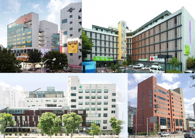 ¿ÞÂÊ À§ºÎÅÍ ½Ã°è ¹æÇâÀ¸·Î H+¾çÁöº´¿ø(½Å¸²), ³ì»öº´¿ø(»ç°¡Á¤), ´ëÇ׺´¿ø(»ç´ç), ÇѼֺ´¿ø(¼®ÃÌ)