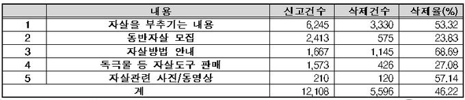 ¹ß°ßµÈ ÀÚ»ìÀ¯ÇØÁ¤º¸ ³»¿ëÀº ¡âÀÚ»ìÀ» ºÎÃß±â´Â ³»¿ë(6245°Ç, 51.6%) ¡âµ¿¹ÝÀÚ»ì ¸ðÁý(2413°Ç, 19.9%) ¡âÀÚ»ì¹æ¹ý ¾È³»(1667°Ç, 13.8%) ¡âµ¶±Ø¹° µî Àڻ쵵±¸ ÆÇ¸Å(1573°Ç, 13.0%) ¡âÀÚ»ì °ü·Ã »çÁø․µ¿¿µ»ó °ÔÀç(210°Ç, 1.7%) µîÀ̾ú´Ù.