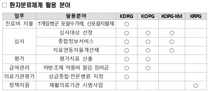 ȯÀںзùü°è´Â ȯÀÚÀÇ Áø´Ü¸í, ½Ã¼ú¸í, ±â´É»óÅ µîÀ» Ȱ¿ëÇØ ȯÀÚ¸¦ ÀÓ»óÀû ÀÇ¹Ì¿Í ÀÇ·áÀÚ¿ø ¼Ò¸ð Ãø¸é¿¡¼ À¯»çÇÑ ±×·ìÀ¸·Î ºÐ·ùÇϴ ü°è´Ù. Æ÷°ý¼ö°¡Á¦, ½É»çÆò°¡ ÁöÇ¥, »ó±ÞÁ¾ÇÕº´¿ø, Àü¹®º´¿ø ÁöÁ¤ µî¿¡ Ȱ¿ëµÈ´Ù.