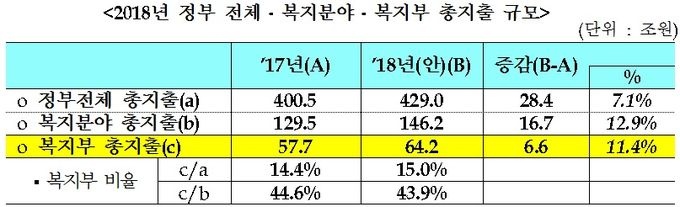 ¿ì¼± º¹ÁöºÎÀÇ ³»³â ÃÑÁöÃâ ±Ô¸ð´Â 64Á¶2416¾ï¿øÀ¸·Î Ã¥Á¤µÆ´Ù. ÀÌ´Â Á¤ºÎ Àüü ÃÑÁöÃâ(429Á¶¿ø)ÀÇ 15% ¼öÁØÀ¸·Î, Àü³â´ëºñ 11.4% Áõ°¡ÇÑ ¼öÄ¡´Ù. ±Ý¾×À¸·Î´Â 6Á¶6000¾ï¿ø ÀλóÀÌ´Ù.