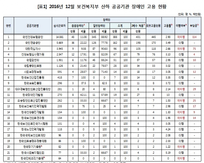 7ÀÏ ÀÚÀ¯Çѱ¹´ç ±è½ÂÈñ ÀÇ¿øÀÌ Çѱ¹Àå¾ÖÀΰí¿ë°ø´ÜÀ¸·ÎºÎÅÍ Á¦Ãâ¹Þ¾Æ °ø°³ÇÑ ÀÚ·á¿¡ µû¸£¸é º¸°Çº¹ÁöºÎ »êÇÏ 25°³ Áß 8°÷ÀÌ, ½ÄǰÀǾàǰ¾ÈÀüó »êÇÏ 3°³ Áß 2°³ ±â°üÀÌ Àå¾ÖÀÎ Àǹ«°í¿ë·ü(2016³â 3.0%)À» ´Þ¼ºÇÏÁö ¸øÇß´Ù.