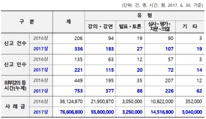 ƯÈ÷ ÀÓÁ÷¿øµéÀÌ ¿ÜºÎ°ÀǸ¦ ÅëÇØ Áö±Þ¹Þ´Â »ç·Ê±ÝÀÌ 3612¸¸¿ø¿¡¼ 7660¸¸¿øÀ¸·Î 2¹è ÀÌ»ó ´Ã¾î³µ´Ù. ¿ÜºÎ°ÀÇ 1°Ç ´ç »ç·Ê±ÝÀº 22¸¸8000¿ø, 1½Ã°£´ç 10¸¸1740¿øÀ¸·Î Á¶»çµÆ´Ù.