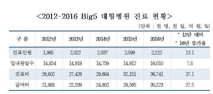 ºò5º´¿ø¿¡¼ Áø·á¸¦ ¹ÞÀº ȯÀÚ´Â 2012³â 196¸¸5000¿© ¸í¿¡¼ 2016³â 222¸¸2000¸íÀ¸·Î 25¸¸7000¸í(13%) Áõ°¡ÇÑ ¹Ý¸é, Áø·áºñ´Â 2012³â 2Á¶6802¾ï ¿ø¿¡¼ 3Á¶6741¾ï ¿øÀ¸·Î 1Á¶¿ø(37%) °¡±îÀÌ Áõ°¡ÇÑ °ÍÀÌ´Ù.