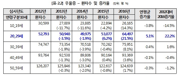 20ÀÏ ±¹È¸ º¸°Çº¹ÁöÀ§¿øÈ¸ À±¼ÒÇÏ ÀÇ¿ø(Á¤ÀÇ´ç)ÀÌ °Ç°º¸Çè½É»çÆò°¡¿ø ÀڷḦ ºÐ¼®ÇÑ °á°ú¿¡ µû¸£¸é ÃÖ±Ù 5³â°£ ±Ù°ñ°Ý°èÁúȯ·¼ÒȰèÁúȯ·Á¤½Å°Ç°°ü·ÃÁúȯ·ºñ´¢»ý½Ä°èÁúȯ µî ÀϺΠÁúȯÀÚ ¼ö Áõ°¡À²ÀÌ ³ë³âÃþÀ» Á¦¿ÜÇϰí 20´ë¿¡¼ °¡Àå Å©°Ô ³ªÅ¸³µ´Ù.