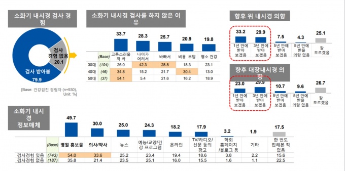 ¶ÇÇÑ ÀÏ¹Ý ³»½Ã°æ(À§³»½Ã°æ26.3%, ´ëÀå³»½Ã°æ 10.9%)¿¡ ºñÇØ ÁøÁ¤ ³»½Ã°æ(À§³»½Ã°æ 44.7%, ´ëÀå³»½Ã°æ 80.3%) °Ë»ç¸¦ ¹Þ´Â ºñÀ²ÀÌ ³ô¾ÒÀ½¿¡µµ ºÒ±¸Çϰí ÁøÁ¤³»½Ã°æ °Ë»ç ÈÄ ±â¾ï·ÂÀÌ °¨ÅðÇÒ ¼ö ÀÖ´Ù´Â À߸øµÈ Á¤º¸¸¦ »ç½Ç·Î ÀÎÁöÇϰí ÀÖ´Â ºñÀ²ÀÌ 32%¿¡ ´ÞÇÏ´Â µî ¿Ã¹Ù¸¥ Á¤º¸ ȹµæ ¼öÁØÀÌ ³ôÁö ¾Ê¾Ò´Ù.